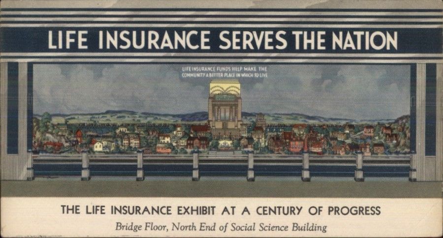 1933年,已有82年历史的世博会在美国芝加哥城米歇根河畔举办,这是大萧条背景下第一届有明确主题的世博会——“一个世纪的进步”的主题吸引了全球的目光,美国力图借此盛会重振世界经济,汽车、百货、食品、娱乐、运输等行业巨头首次被获准自建场馆,以全新的电影、立体布景、流水线实景、露天展以及绚烂色彩强势登场。此次世博会轰动全球,科学进步的全面展现令数百万参观者感受到了新希望。 鸟瞰1933年芝加哥世博会会场。 特别值得一提的是,美国人寿保险协会别出心裁,第一次以绝妙的创意向世人呈现了寿险作为一种新势力在未来社会经济生活中的责任与担当。 1933年芝加哥世博会上,美国人寿保险协会别出心裁,第一次以绝妙的创意向世人呈现了寿险作为一种新势力在未来社会经济生活中的责任与担当。 现代保险起源于水上保险,中世纪海上贸易的兴起,以风帆为动力船舶很容易遭遇风浪和海盗的风险。12世纪中叶,希腊和罗马的商人组织起了一种互助团体以寻求保障。到了16世纪,船舶货物保险在英国正式创立,开始出具保单,收取保费,支付赔款,现代保险浮出水面。此时虽然船舶货物有了保险,但海员的人身安全仍没有保障。风险的存在创造了保险的需求,此时的海员们主张对于丧失生命的海员家属也应有保险,这一需求促成了人寿保险的萌生。1583年6月15日,在伦敦正式签署了世界上最早的人寿保单,被保险人是英国人威廉姆葛朋,承保人并不是正式的公司,而是16个投机的人。这张保单被视作现代人寿保险的起源,伦敦成为现代寿险的摇篮。 自此以后,人寿保险开始受到关注,各种人寿保险的公司会社纷纷成立。最初成立的公司当以1720年成立的英国皇家人寿保险公司为鼻祖。(参见张似旭:外商在华经营人寿保险事业之概况《寿险季刊》1933年第一卷第三期。) 美国最早的保险组织是与火灾相关的保险互助机构。1735年,住房火灾互保友好会社(Friendly Society for Mutual Insuring of House against Fire)在南加利福尼亚州查尔斯顿成立。那时美国的建筑木制结构为主,火灾风险大,引发了最初的火灾保险需求。随着火灾保险互助组织的发展,这一时期其他险种也有了萌生,比较突出的是人身保险和年金。当时一些人开始自愿地向贫穷的长老会教长及家属捐助,但这不是长久之计。于是,1754年人们决定成立一个长老信徒基金会,由会员共同集资。1759年,经特许成立了贫困长老会牧师及其受赡养人救济公司(The Corporation for the Relief of Poor and Distressed Presbyterian Ministers and Their Widows and Children)。1761年该公司签发了第一张保险单。这家公司业务发展很快,后改名为长老牧师基金会。不过由于当时缺少生命统计资料,寿险保障很粗糙,主要对孤寡老人和穷人提供救助。其后50年,规范的商业寿险才在美国出现。1792年,一些商人创建了美国第一家现代意义的保险公司——“北美保险公司”(The Insurance Company of North America),承保水险、火险和寿险业务。1890年,美国有了第一家专业的商业寿险公司——宾夕法尼亚人身和年金保险公司(The Pennsylvania Company for Insurance on Lives and Granting Annuities)。 人寿保险自第一张保单起,到芝加哥世博会,已有了350年的历史,美国的寿险也有了近180年的发展。此时美国已是世界第一的寿险大国,有效保额达1090亿美元,各寿险公司资产总额达200亿美元,被保险人总额超过了6500万,占其总人口的60%。不但这几千万人的生活得到保险保障,而且国内的一切建设事业也得到了寿险资金的支持,寿险在社会经济发展中扮演者越来越重要的角色。 在1929年世界经济危机的打击下,1933年的美国经济一派萧条,人们生活没有保障,经济建设缺少资金与活力,这一切让人们对寿险的发展有了更多的期待。芝加哥世博会寿险展的策划有着重大的现实意义,承担起更多的社会责任。 当时我国中华人寿保险协进社创办的《寿险季刊》对芝加哥世博会寿险展评论道:“此种展览具有引人入胜的魔力,使各地来观光的游客,看见了之后都能得一种影像:就是人寿保险事业,确能为国家尽投资服务之责任的,那新奇而富有刺激性的陈设全都由名家沙唐纳氏计划,匠心独运煞费一番苦心。”(《寿险季刊》1933年第一卷第三期35页) 这个寿险展为一个巨大的橱窗——寛60呎(18.3米),深15呎(4.6米),窗内为美国普通社会缩影的模型,代表着当时美国人生活的场景:住宅、工厂、办公房、商店、公共设施、郊外农村等。街面上路人在行走,道路上汽车在奔驰,公园里儿童在游戏,田野里农民在耕耘,有的地方在筑路,有的地方在盖楼……一如人们日常所见,应有尽有,形态逼真。在这场景后方正中,矗立着一栋庄严的寿险大厦,统治着整体的格局,暗示着人寿保险事业在人们生活中稳固而坚定的力量。 1933年芝加哥世博会寿险展明信片。 模型表演启动,绚烂的灯光衬托着主题文字,同时有无线电画外音解说,观众可一目了然。第一幕是一群市民走入那寿险大厦,代表被保险人开始投保,当他们缴纳保费时寿险大厦上的储蓄箱里,便渐渐自动装满了资金,后面的壁板上会显示灯光照耀的字迹,同时有画外音解释。首先显示的标题是:“6500万位被保险人加入寿险”,待大厦上储蓄箱满了之后,标题文字切换为“人寿保费200亿美元”,紧接着标题文字显示“人寿保险的投资可助社会发展改进民生”。这时寿险保费收入开始
